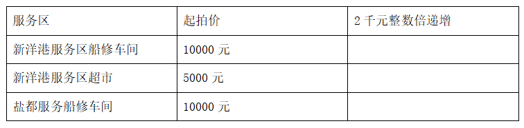 競(jìng)拍形式:公開(kāi)競(jìng)拍,拍租期限為1年,每個(gè)服務(wù)區(qū)的競(jìng)拍項(xiàng)第一年承租費(fèi)起拍價(jià)為1萬(wàn)元,按2千元整數(shù)倍遞增(如2000、4000、6000、8000……)。如下表: