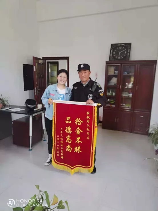原來,不久前該公司員工周漢松在小區(qū)巡邏時撿到一部智能手機,因為手機鎖屏無法聯(lián)系到失主,在原地等待了一段時間后,仍未等到失主,他第一時間將情況上報給公司領導。過了幾個小時后,失主打來電話言明自己手機丟失,周漢松在核實手機型號無誤后,告知她手機已在物業(yè)服務中心得到妥善保管,并讓她盡快攜身份證前來領取。
