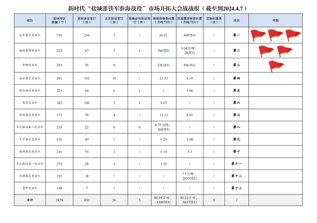 2.簽訂意向協(xié)議數(shù)量930份:其中大豐港區(qū)突擊隊254份,響水港區(qū)突擊隊103份,黨員突擊隊100份,巾幗突擊隊76份,濱海港區(qū)突擊隊76份,航運集團突擊隊67份,射陽港區(qū)突擊隊64份,建湖港區(qū)突擊隊55份,阜寧港區(qū)突擊隊40份,亭湖港區(qū)突擊隊38份,多式聯(lián)運第一突擊隊28份,多式聯(lián)運第二突擊隊22份,青年突擊隊7份。