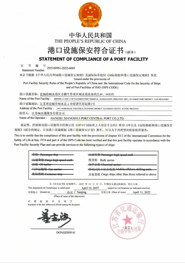 近日,在省、市相關(guān)部門(mén)、專(zhuān)家和咨詢單位的大力支持幫助下,響水港區(qū)、射陽(yáng)港區(qū)10個(gè)萬(wàn)噸級(jí)以上泊位順利獲得江蘇省交通運(yùn)輸廳核發(fā)的港口設(shè)施保安符合證書(shū),為響水港區(qū)、射陽(yáng)港區(qū)一類(lèi)開(kāi)放口岸國(guó)家級(jí)驗(yàn)收奠定了堅(jiān)實(shí)基礎(chǔ)。