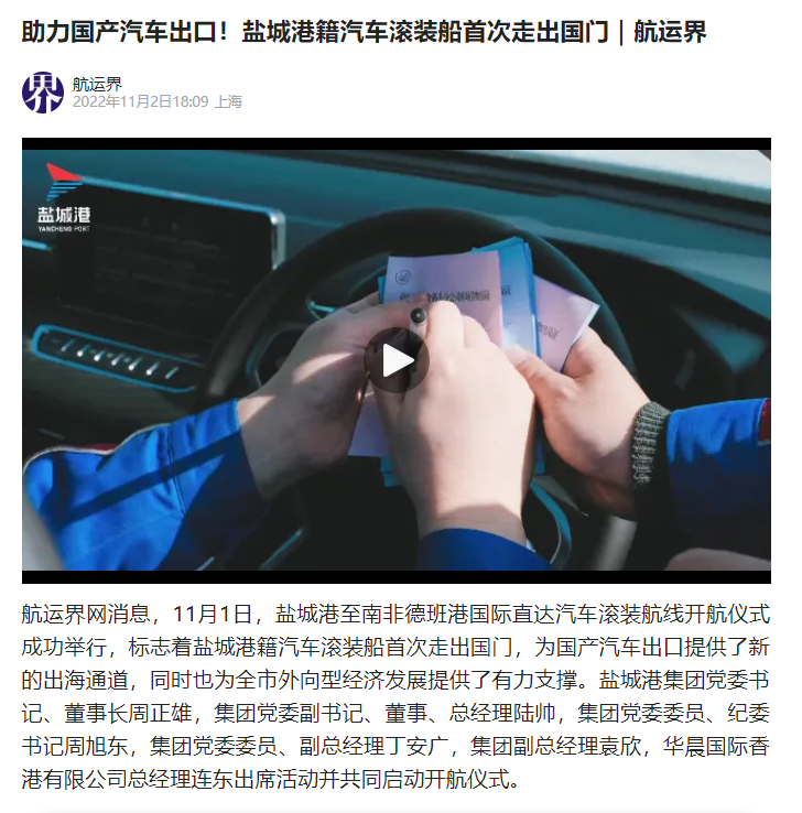 鹽城港至南非德班港國(guó)際直達(dá)汽車滾裝航線開航