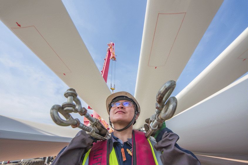 射陽(yáng)港口碼頭工人在進(jìn)行風(fēng)電葉片轉(zhuǎn)船檢查