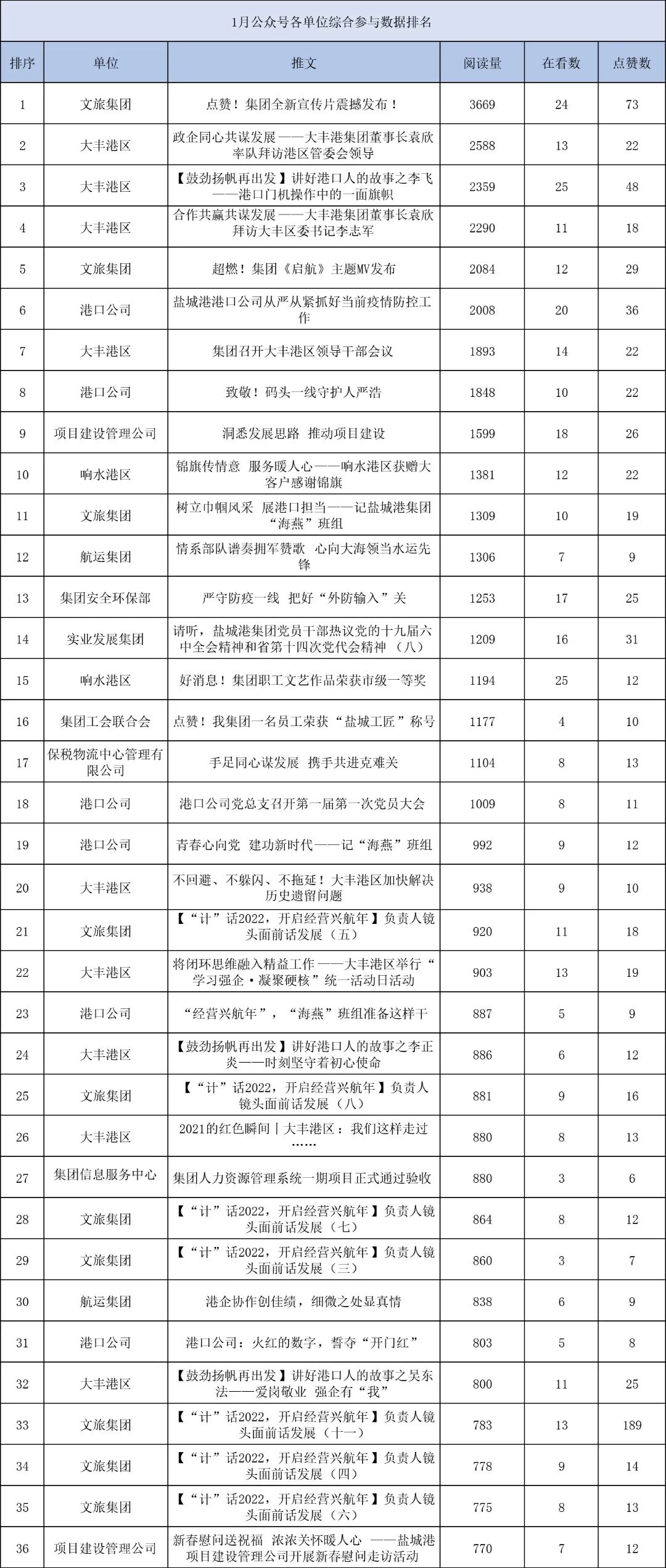 1月,“江蘇鹽城港控股集團(tuán)”微信公眾號(hào)推送文章170篇,截至目前,閱讀總量14萬(wàn)+,各單位供稿111篇。其中,文旅集團(tuán)以2.1萬(wàn)閱讀數(shù),24篇稿件量,遙遙領(lǐng)先;大豐港區(qū)以1.8萬(wàn)閱讀數(shù),16篇稿件量,位列第二;港口公司、響水港區(qū)在供稿方面,以同樣13篇的數(shù)量并列第三,在閱讀量方面,港口公司以1.2萬(wàn)的數(shù)量,位列單項(xiàng)第三;其他港口及板塊集團(tuán)積極參與,踴躍投稿,情況較好。