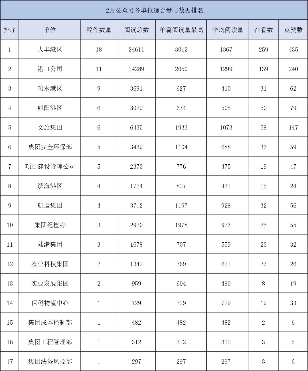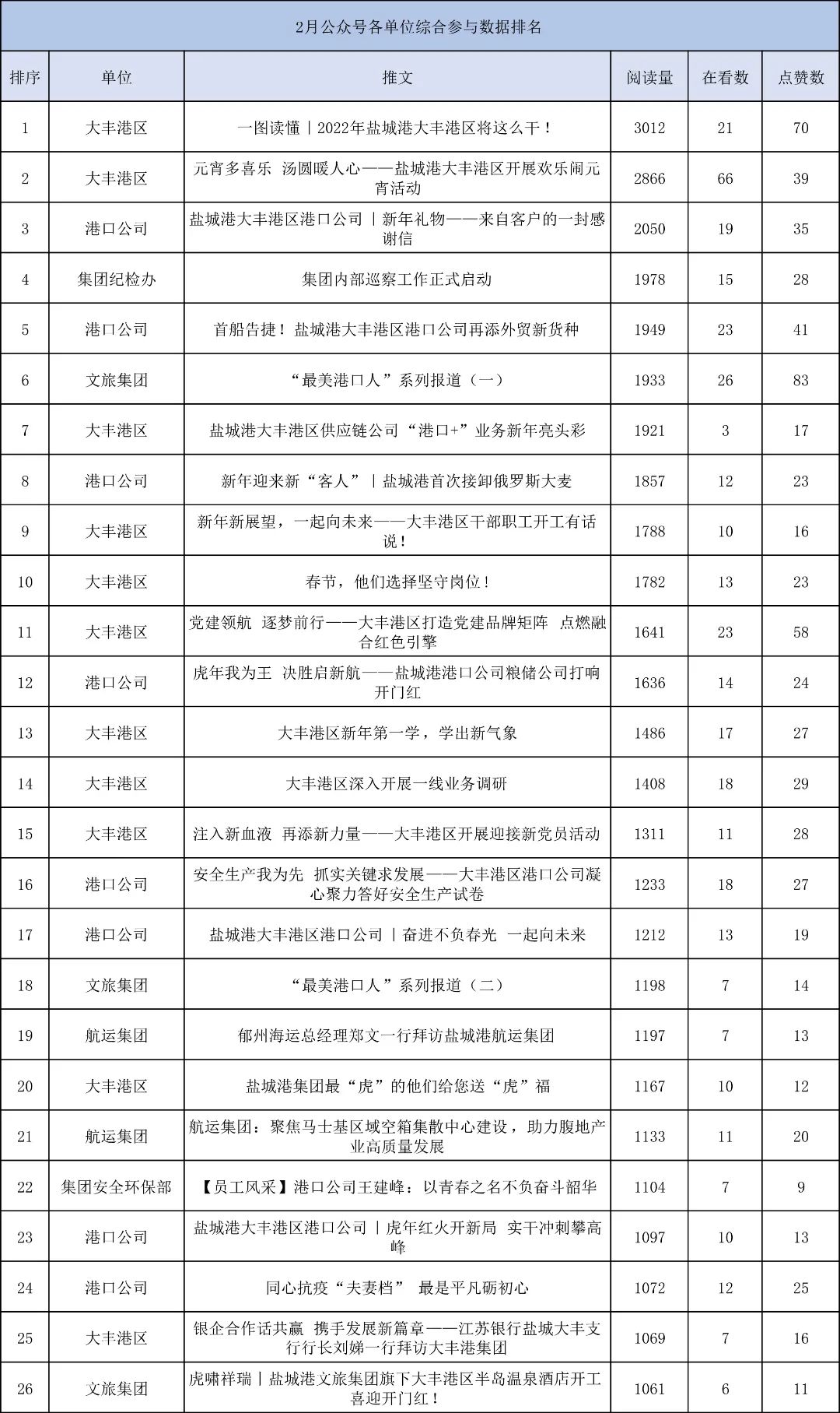 2月榜單,鹽城港集團(tuán)公眾號(hào)“前浪”表現(xiàn)可圈可點(diǎn),“后浪”蓄勢待發(fā)。這個(gè)2月,是誰遙遙領(lǐng)先?誰又在奮起直追?請(qǐng)看2月榜單!