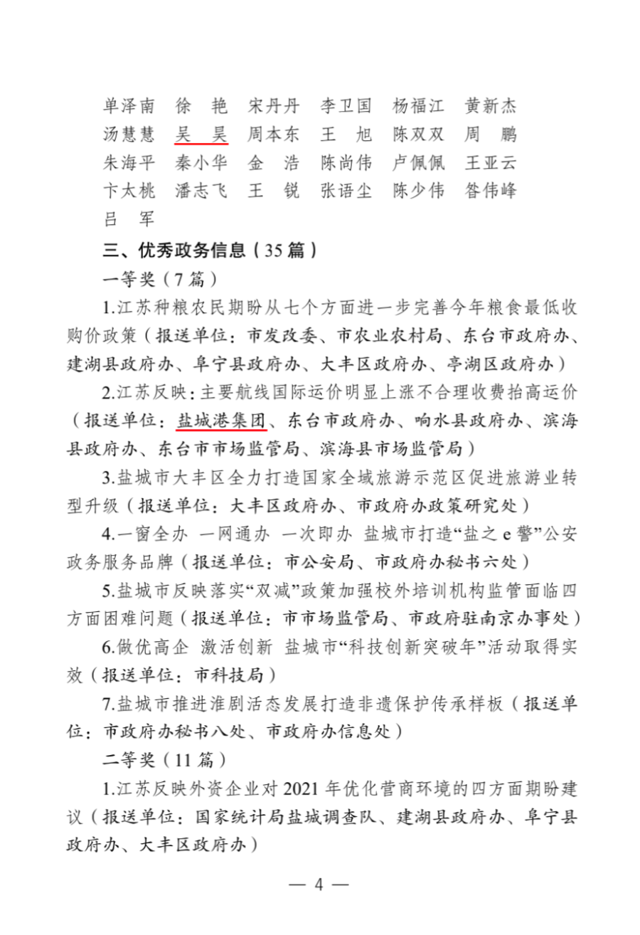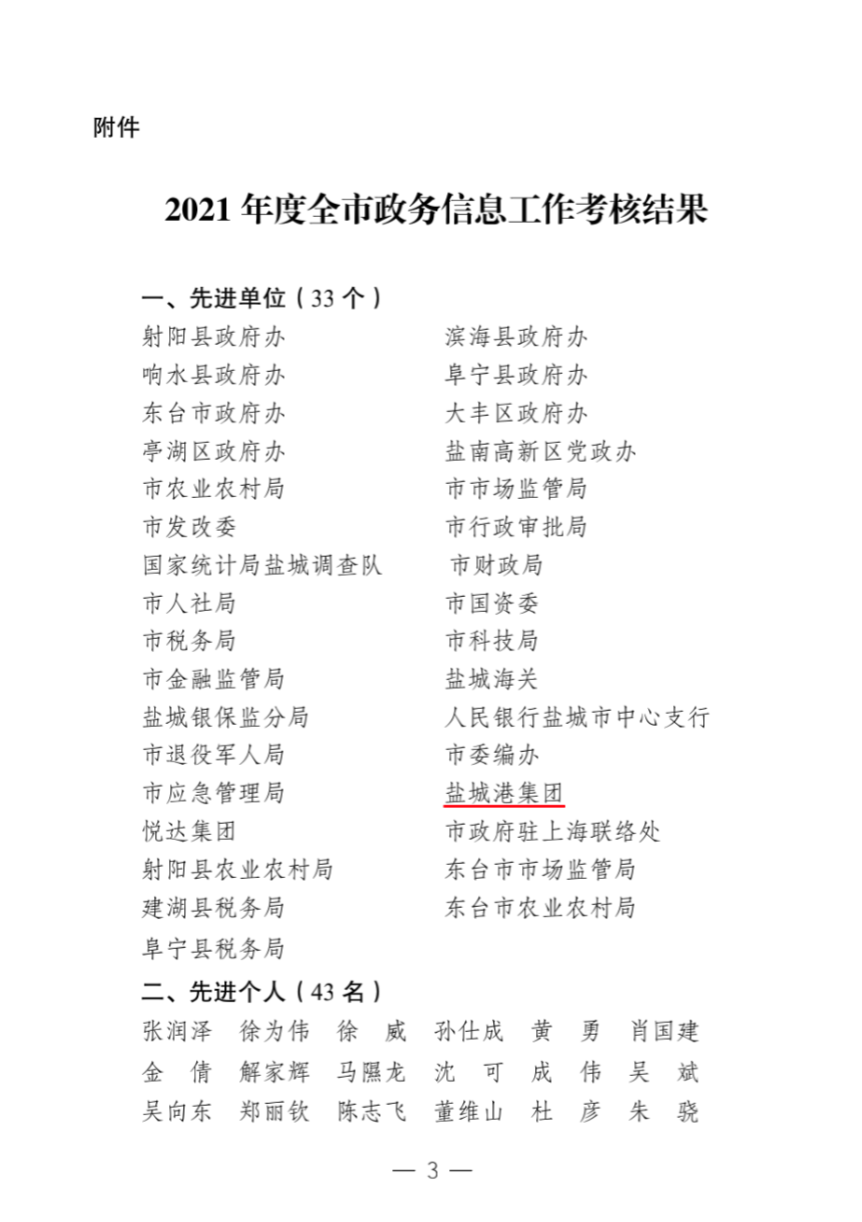 3月8日,市政府辦公室公布2021年度全市政務信息工作考核結(jié)果,集團獲評“2021年全市政務信息工作先進單位”,位列市直報點單位前列。同時,我集團參與報送的《江蘇反映:主要航線國際運價明顯上漲不合理收費抬高運價》榮獲優(yōu)秀政務信息一等獎。集團新聞條線一名同志獲“2021年全市政務信息工作先進個人”稱號。