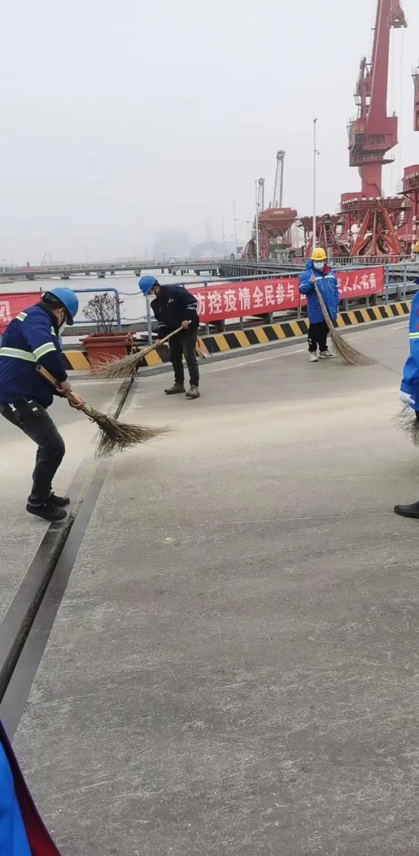 (生產部人員正在碼頭進行拋灑貨物清理)