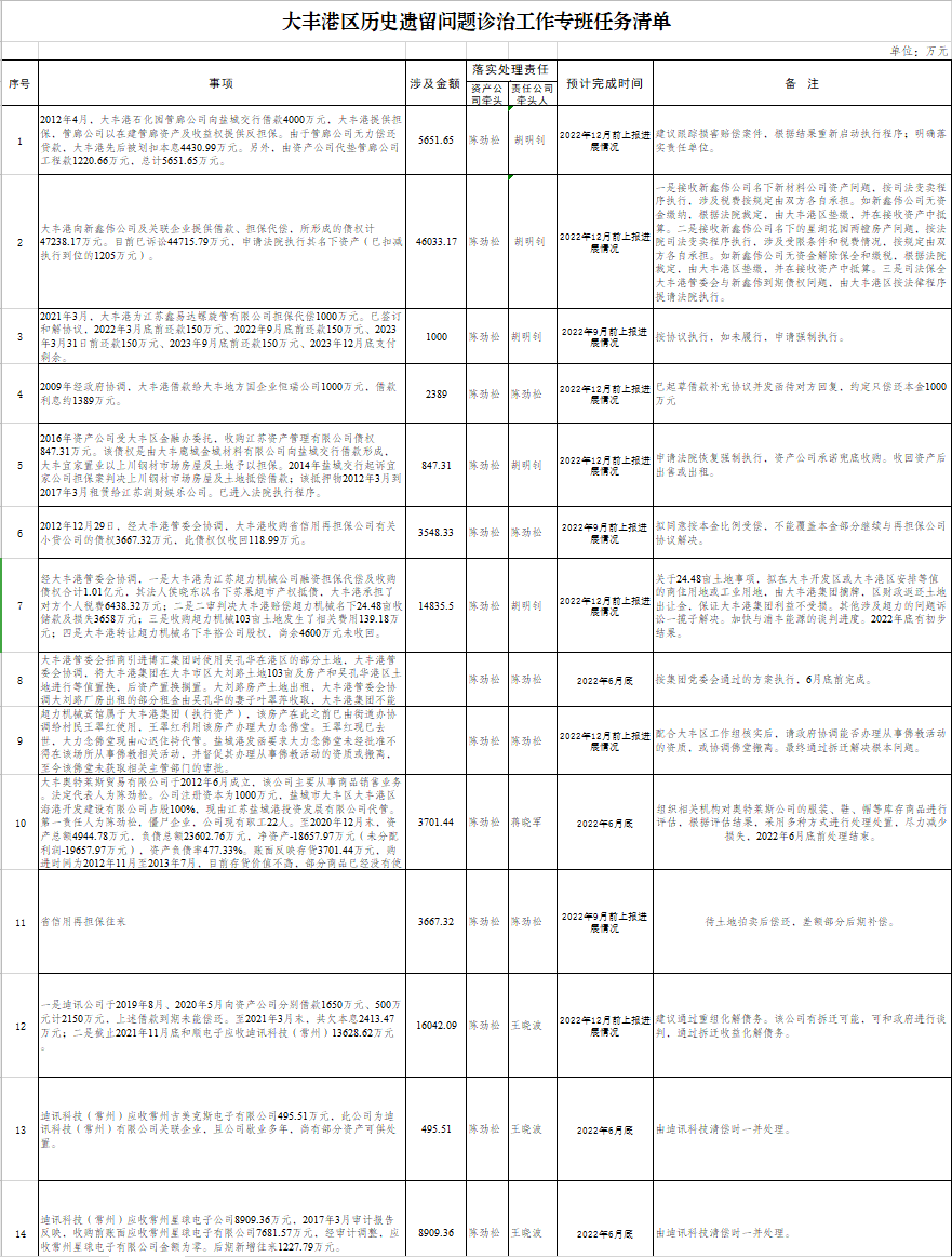 在“六清”的基礎(chǔ)上,梳理大豐港區(qū)歷史遺留問題診治工作專班任務(wù)清單計(jì)97項(xiàng),并完成任務(wù)清單說(shuō)明;完成江蘇大豐海港控股集團(tuán)有限公司涉及“國(guó)企債券專項(xiàng)審計(jì)調(diào)查發(fā)現(xiàn)問題整改工作”,并將整改工作采取的措施和整改進(jìn)展情況等形成工作報(bào)告上報(bào)大豐區(qū)國(guó)資委;共計(jì)處理處置大豐港區(qū)歷史遺留有問題往來(lái)74筆,金額8.09億元。截至5月31日已完成大豐港區(qū)歷史遺留問題診治工作專班任務(wù)清單計(jì)15項(xiàng),涉及金額2.81億元。