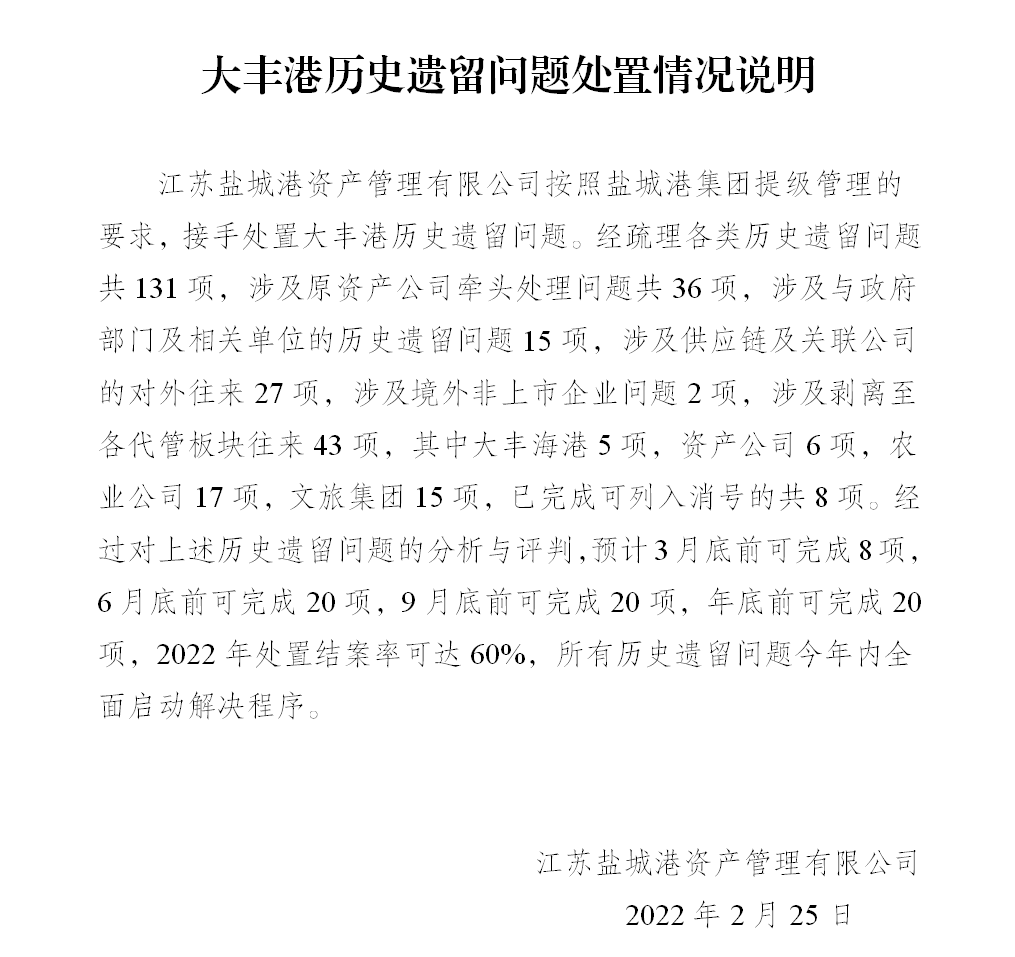 成立大豐港區(qū)代管企業(yè)整合、清算工作小組,涉及處理企業(yè)34家,其中:擬合并13家,擬關(guān)閉19家,擬轉(zhuǎn)讓非實(shí)際控制2家。