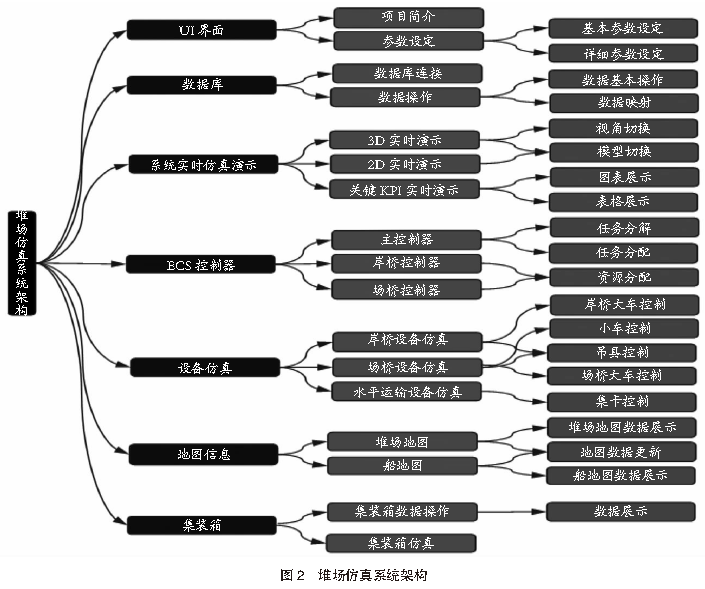 3仿真模型搭建3.1 堆場仿真系統架構根據港口堆場作業特點和堆場系統功能,設計搭建港口堆場仿真系統架構。該架構主要包括UI界面、數據庫、系統實時仿真演示、ECS控制器、設備仿真、地圖信息、集裝箱等部分,主要用于實現數據交互、模型設計、任務調度管理、仿真測試、結果演示等功能。堆場仿真系統架構見圖2。