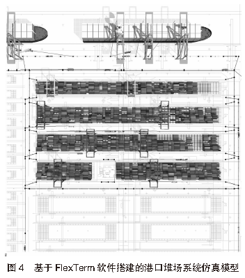 3.2 堆場仿真系統模型根據堆場仿真系統架構,以某港口自動化堆場作業的實際運行環境為基礎,分別搭建基于AnyLogic軟件和FlexTerm軟件的港口自動化堆場系統仿真模型。基于AnyLogic軟件搭建的港口堆場系統仿真模型見圖3,基于FlexTerm軟件搭建的港口堆場系統仿真模型見圖4。