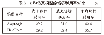 4仿真結果分析利用港口自動化堆場相關數據,分別對基于AnyLogic軟件和FlexTerm軟件的堆場系統仿真模型的仿真結果進行對比分析。4.1 場橋利用率對比在集裝箱堆場作業中,場橋是提高堆場作業效率的關鍵因素。合理分析場橋利用率對提高堆場作業效率、減少船舶在港停泊時間尤為重要。根據港口提供的堆場作業參數和實際堆場作業的場橋利用情況,對堆場內場橋使用情況進行仿真對比分析。AnyLogic仿真模型的場橋利用率見表4,FlexTerm仿真模型的場橋利用率見表5,2種仿真模型的場橋利用率對比見表6。