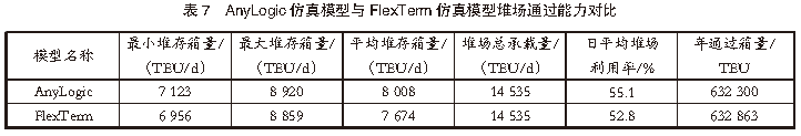 經綜合分析發現,無論是單一場橋利用率還是平均場橋利用率,AnyLogic仿真模型的數據結果都普遍高于FlexTerm仿真模型的數據結果。通過分析堆場作業系統仿真流程發現,上述差異是由2種仿真模型的作業指令生成模式不同導致的。在相同的作業時段內,AnyLogic仿真模型的作業指令生成的作業數量要高于FlexTerm仿真模型的作業指令生成的作業數量,從而導致AnyLogic仿真模型的場橋利用率高于FlexTerm仿真模型的場橋利用率。根據港口提供的數據,全年該港口自動化堆場的場橋利用率在40%~60%。基于AnyLogic仿真模型和FlexTerm仿真模型仿真得到的平均場橋利用率分別為42.4%、35.7%。顯然,與FlexTerm仿真模型的仿真結果相比,AnyLogic仿真模型的仿真結果同實際作業數據的統計結果更接近。究其原因,這是由2款仿真模型的集裝箱裝卸作業指令的生成模式不同導致的。對堆場作業系統仿真流程分析發現:在AnyLogic仿真模型中,集裝箱裝卸作業指令是根據港口歷史數據,借助算法計算生成的,比較接近港口的實際作業數據;在FlexTerm仿真模型中,集裝箱裝卸作業指令是利用軟件自帶作業計劃模塊,通過配置船期、堆場計劃等參數自動生成的,與港口實際作業數據之間存在一定的差距。4.2 堆場使用情況對比為了合理規劃堆場空間資源,根據港口提供的船期、堆場計劃等參數,對港口堆場的使用情況進行仿真對比分析。AnyLogic仿真模型與FlexTerm仿真模型堆場通過能力對比見表7。由表7可知,在相同輸入條件下,AnyLogic仿真模型和FlexTerm仿真模型仿真模擬得到的堆場利用情況和堆場通過能力基本一致。但由于泊位船舶計劃較為寬松,船期密度小于實際船期數據,AnyLogic仿真模型和FlexTerm仿真模型的堆場通過箱量分別為632 300 TEU和632 863 TEU,均小于港口全年實際堆場通過箱量724 272 TEU。