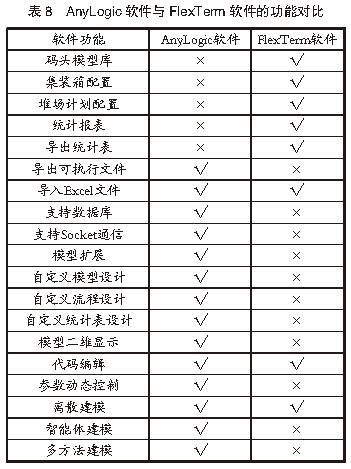 通過仿真分析結果與實際作業數據的對比發現,仿真分析結果與港口實際運行數據差距較小,表明AnyLogic仿真模型和FlexTerm仿真模型都能準確可靠地模擬港口實際堆場作業情況,能夠滿足港口堆場仿真需求,并有助于提高港口堆場仿真的準確度和可信度。此外,通過分析堆場仿真作業流程還發現,通過調整堆場仿真系統的輸入條件能提升AnyLogic仿真模型和FlexTerm仿真模型的仿真效果,其中:通過調整輸入條件對應的關鍵參數來提升AnyLogic仿真模型的仿真效果;通過修改輸入條件中作業計劃模塊的船期、堆場計劃等相關配置來提升FlexTerm仿真模型的仿真效果。4.3 軟件功能對比回顧整個堆場仿真作業流程發現,2款軟件在功能應用方面存在一定差異。根據仿真作業流程和仿真分析結果,對2款軟件的功能進行對比分析,AnyLogic軟件與FlexTerm軟件的功能對比見表8。