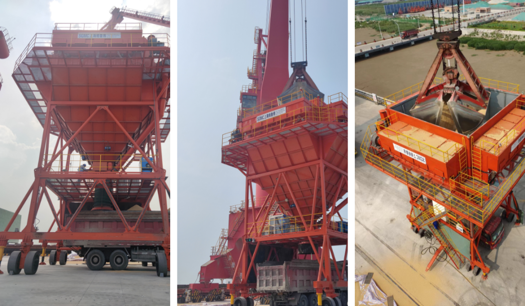 由于糧食作業粉塵較大,對環境造成污染較為嚴重,為確保大輪接卸過程安全順利且符合環保要求,響水港區啟用了防塵料斗。本次作業采用的2臺防塵料斗是響水港區采購的環保利器,自重76噸,斗容量達50立方,全身紅色,采用負壓抑塵系統,整機處理風量高達72000立方/小時,過濾面積高達1200平米,理論除塵率高達90%,是名副其實的除塵悍將!