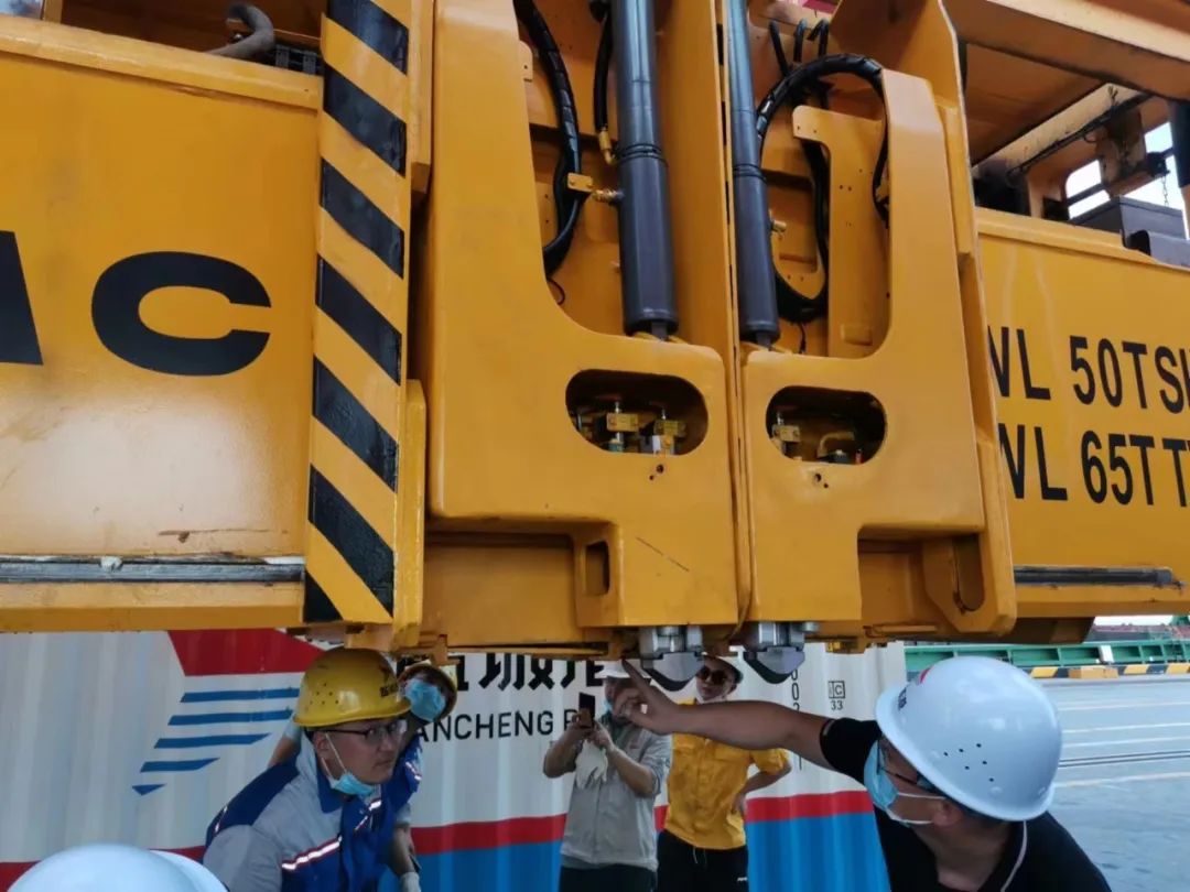 近日,鹽城港大豐港區(qū)第一作業(yè)區(qū)雙箱吊具經(jīng)升級(jí)改造后,完成初步運(yùn)行調(diào)試。