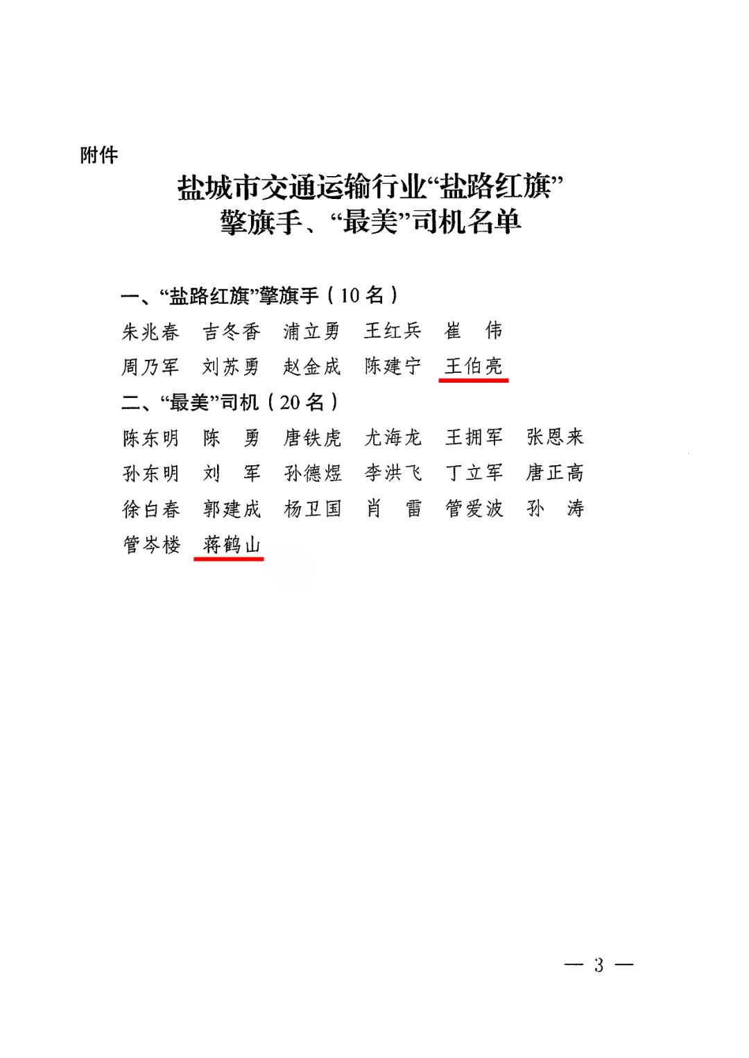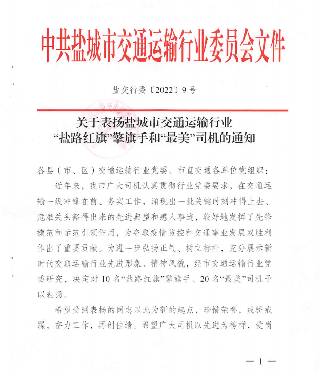 近日,中共鹽城市交通運(yùn)輸行業(yè)委員會(huì)印發(fā)《關(guān)于表揚(yáng)鹽城市交通運(yùn)輸行業(yè)“鹽路紅旗”擎旗手和“最美”司機(jī)的通知》,集團(tuán)大豐港區(qū)王伯亮榮獲“鹽路紅旗”擎旗手榮譽(yù)稱號(hào),集團(tuán)響水港區(qū)蔣鶴山榮獲“最美”司機(jī)榮譽(yù)稱號(hào)。