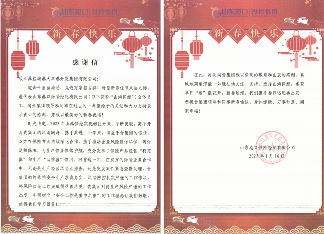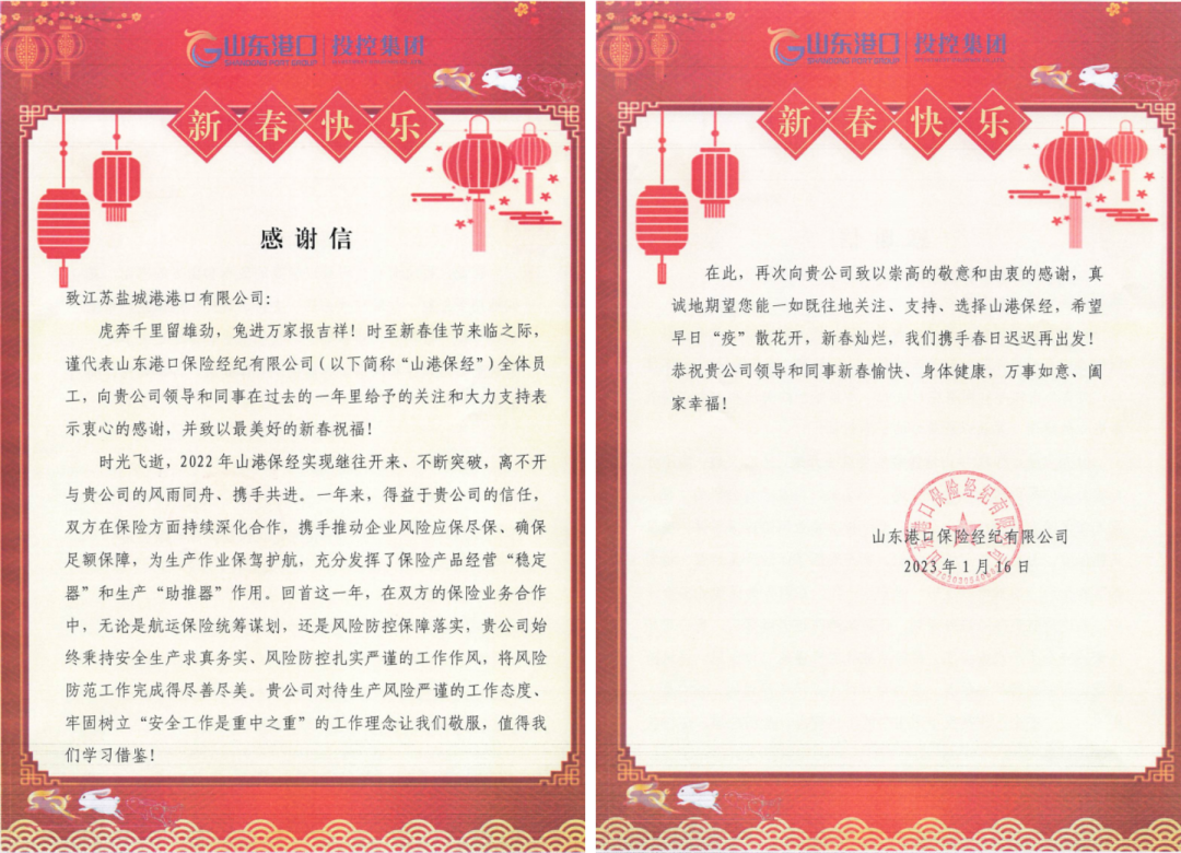 新歲序開,同赴新程。近日,集團下屬江蘇鹽城港大豐港開發(fā)集團、江蘇鹽城港港口公司、江蘇鹽城港航運集團三家單位分別收到來自山東港口保險經紀公司的感謝信。紙短情長,字字暖心。一封封感謝信,道出了鹽城港和山東港攜手發(fā)展的深厚情誼。