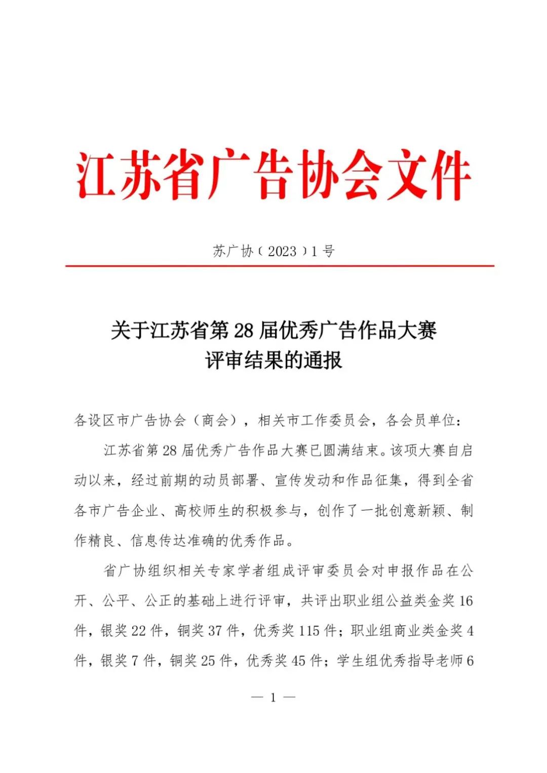 據悉,“江蘇省優秀廣告作品大賽”由江蘇省廣告協會主辦,迄今為止已舉辦28屆,吸引了省內數百家公司參與,每屆賽事均有數千個作品參加比賽。本屆大賽,文旅集團廣告傳媒分公司憑借過硬的專業實力榮獲職業組公益類作品銅獎和職業組公益類作品優秀獎。