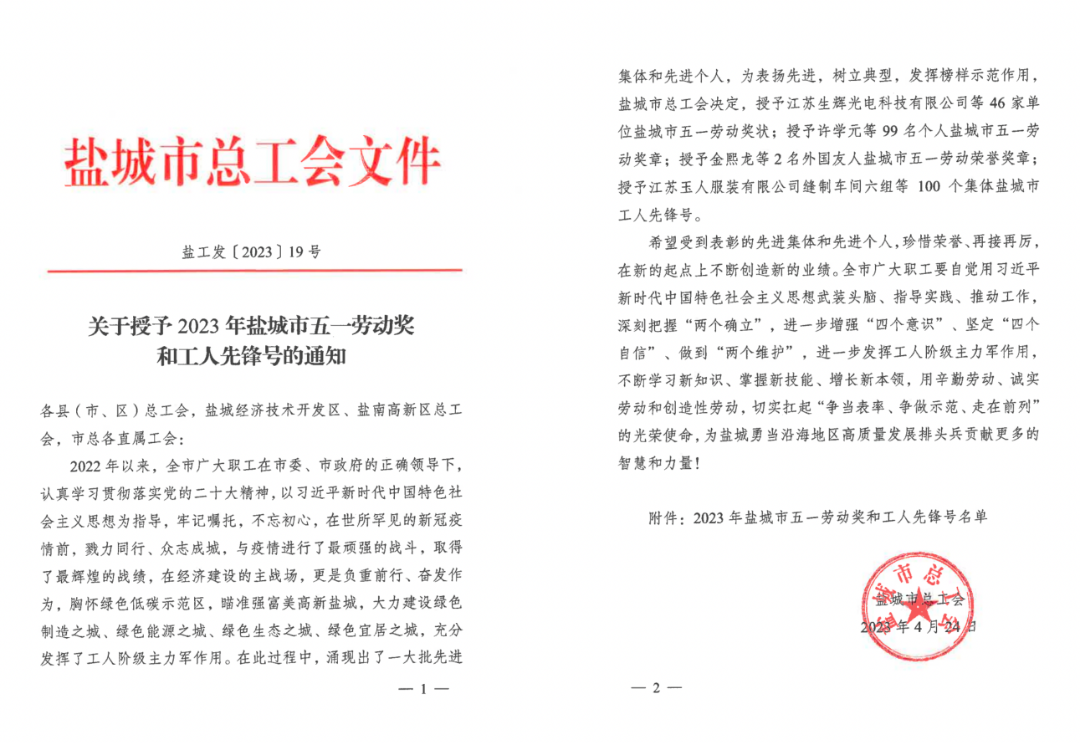 近日,鹽城市總工會印發《關于授予2023年鹽城市五一勞動獎和工人先鋒號的通知》,我集團再獲三項表彰。