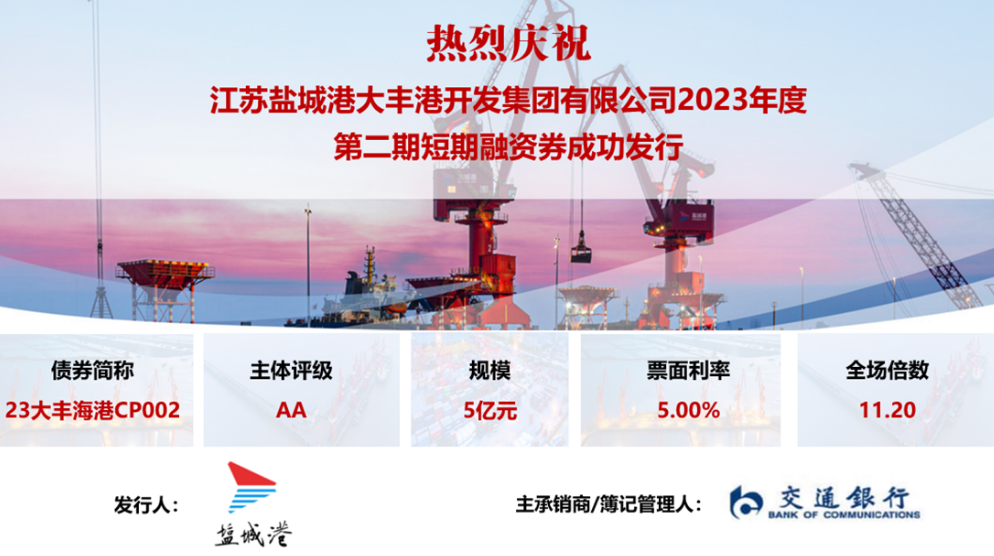 6月29日,大豐港開發集團成功發行2023年度第二期短期融資券,本期短期融資券金額5億元,發行利率5%,認購倍數11.2倍,創下2023年度鹽城地區同一品種申購倍數最高紀錄,充分反映了投資機構對鹽城港發展的高度認可和信任,也為后續資本市場融資奠定了堅實基礎。