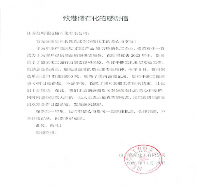 今年以來(lái)港儲(chǔ)石化公司全體干部職工堅(jiān)持以“時(shí)間就是金錢(qián),程序體現(xiàn)規(guī)矩,質(zhì)量鑄就精品,效率就是生命”為宗旨,不斷提升服務(wù)品質(zhì)及工作效率,獲得了客戶的贊賞與肯定。近期,合作客戶山東玉皇盛榮化工寄來(lái)一封感謝信,信中內(nèi)容充分肯定了港儲(chǔ)石化的服務(wù)品質(zhì),并由衷地表達(dá)了感謝。