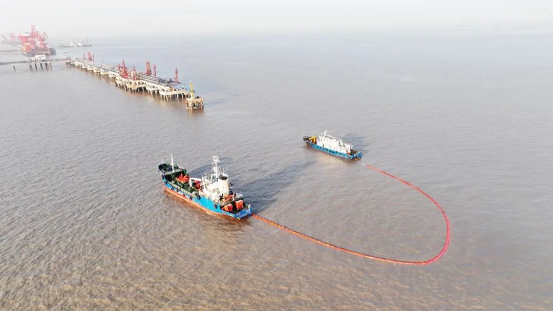 演練模擬在石化碼頭7號(hào)泊位,由于海上風(fēng)浪較大,在此卸船作業(yè)過(guò)程中,貨船受到風(fēng)浪和海水沖擊,致使輸油臂和船方相連法蘭處松動(dòng),柴油從法蘭處噴出,可燃?xì)怏w檢測(cè)儀報(bào)警,發(fā)生泄露溢油安全事故。事故發(fā)生后,石化碼頭應(yīng)急領(lǐng)導(dǎo)小組立即啟動(dòng)事故應(yīng)急預(yù)案,開展事故應(yīng)急處置,控制事態(tài)發(fā)展并及時(shí)向有關(guān)部門報(bào)告。演練期間,各應(yīng)急處置人員反應(yīng)迅速、動(dòng)作規(guī)范、配合默契,溢油快速得到控制和清除。
