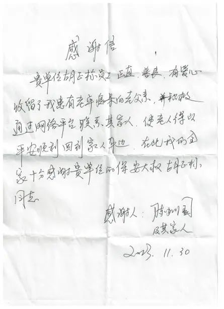 一個中午,響水港區(qū)灌江港務(wù)分公司保安隊(duì)長胡正標(biāo)發(fā)現(xiàn)一位近八旬的老人在碼頭南側(cè)馬路上徘徊且沒有立即離開跡象,便好心上前詢問交流。該位老人冬日里衣著單薄且神志有些不清,問其姓名、家庭住址等信息,老人都言語不佳,回答不出來,且身上沒有任何證件或物件能證明其身份的。于是胡隊(duì)長將其邀請至保安室內(nèi)暖和休息,為他送上熱茶和充饑食物,熱情安撫老人情緒。隨后胡隊(duì)長撥通報(bào)警電話,并將老人照片發(fā)到附近周圍社區(qū)微信群中,很快群內(nèi)有位社區(qū)居民認(rèn)出該位老人。最終在社區(qū)居民的幫助下,聯(lián)系上了老人家屬。在半小時后,老人家屬趕到碼頭接到老人平安回家。在與老人家屬交談中得知,該老人從當(dāng)日早上出門便遲遲未歸家,家人一直在焦急尋找中。針對胡正標(biāo)隊(duì)長的熱心行為,老人家屬萬分感謝。冬日里的這份愛心行為,暖心又暖情,讓這個寒冷的冬日有了暖陽般的溫馨。