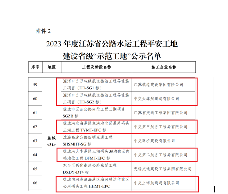 近日,省交通運輸廳發布2023年度全省公路水運工程平安工地建設省級“示范工程(工地)”考核評價結果,鹽城港項目咨詢公司代管項目:響水港區灌河口5萬噸級航道整治工程導堤一標段、導堤二標段,濱海港區主港池北區通用碼頭三期工程、海河聯運作業區公用碼頭工程,大豐港區三期碼頭3#泊位及內檔泊位工程共5個水運項目獲評2023年度江蘇省公路水運工程平安工地建設省級“示范工地”。