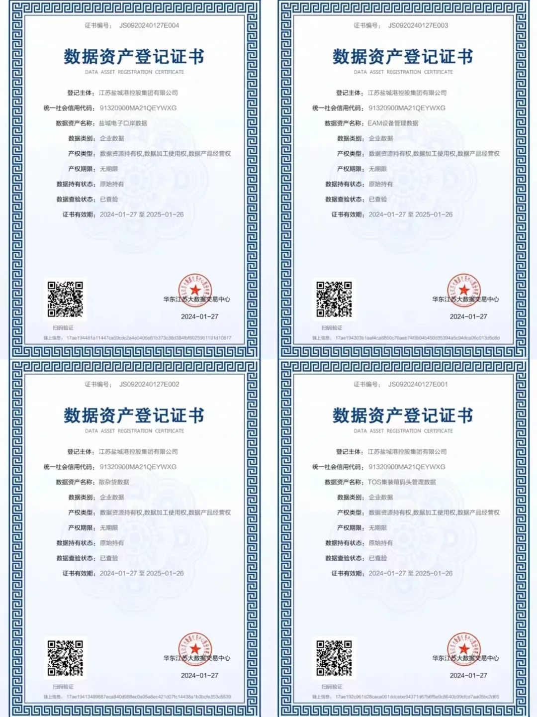 日前,鹽城港集團順利完成集裝箱碼頭生產操作系統(TOS)、電子口岸系統、港機設備物資管理系統(EAM)、散雜貨生產管理系統(MES)數據資產質量評價及價值評估,并獲得《數據資產登記證書》,成為鹽城市首批完成數據資產登記的企業之一,也是全國首個港口企業數據資源入表案例。