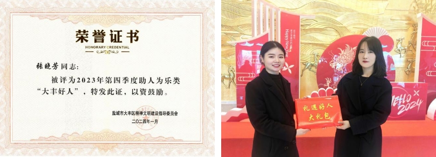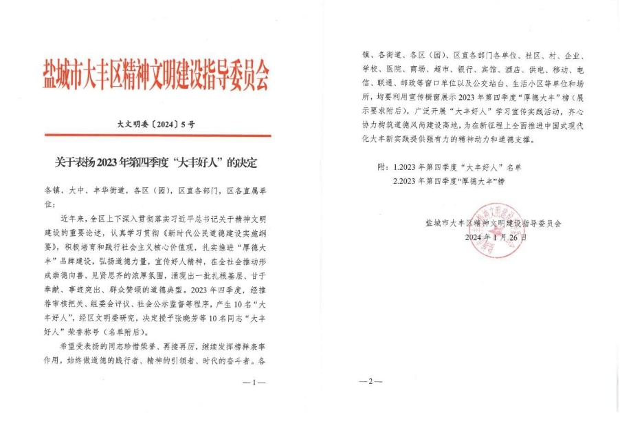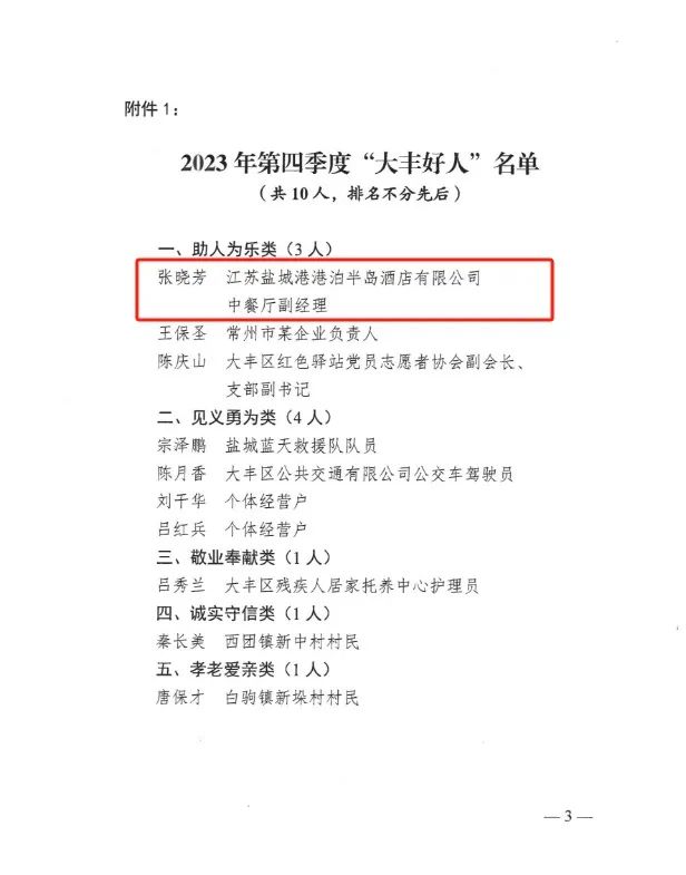 近日,鹽城市大豐區(qū)大力培育和踐行社會核心價值觀,積極開展2023年第四季度“大豐好人”推薦評選表彰活動,著力唱響“厚德大豐”品牌。經(jīng)推薦審核把關(guān)、組委會評議、社會公示監(jiān)督等程序,江蘇鹽城港港泊半島酒店有限公司張曉芳同志被授予“大豐好人”榮譽稱號。