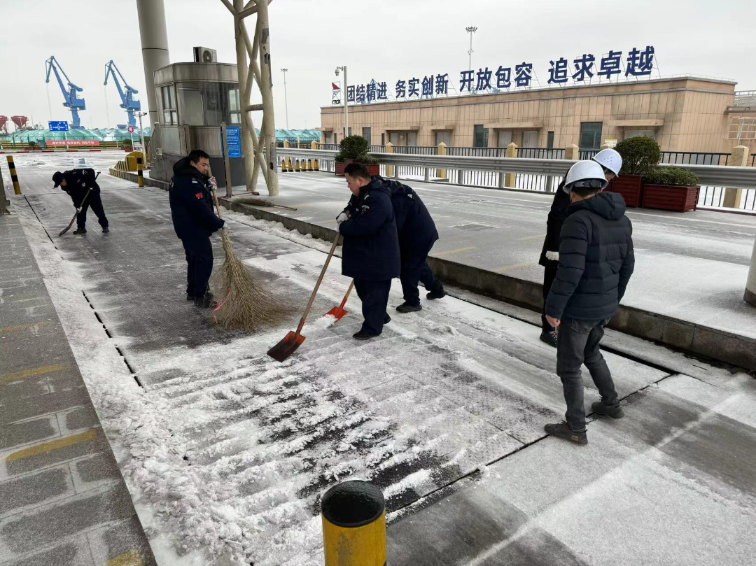 為排除現場積雪,防止道路結冰帶來的安全隱患,響水港區采取“機械+人工”協同作業模式,對港區重點區域、主要道路和交通要道等進行清掃,同時根據道路積雪情況,適時組織拋撒融雪劑,全力以赴保障港區道路暢通及職工出行安全。