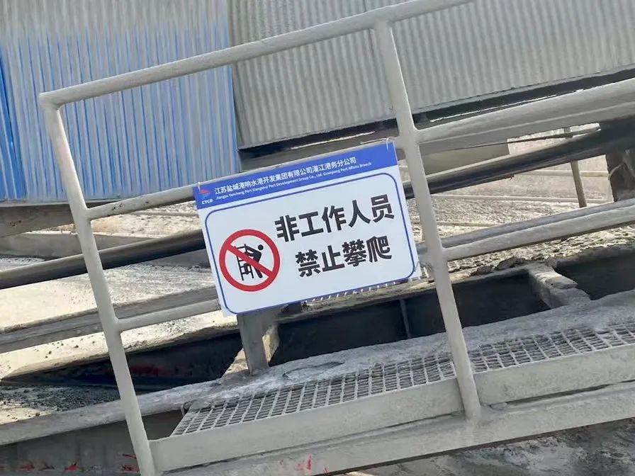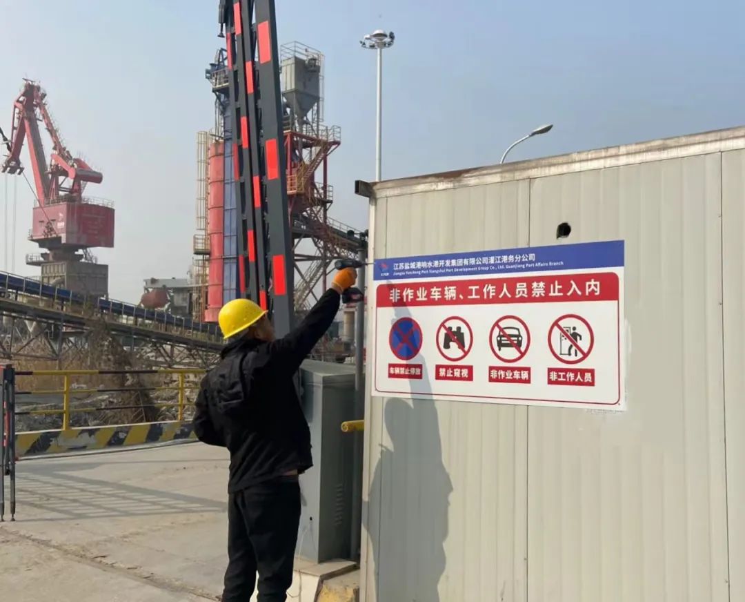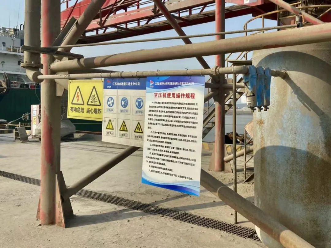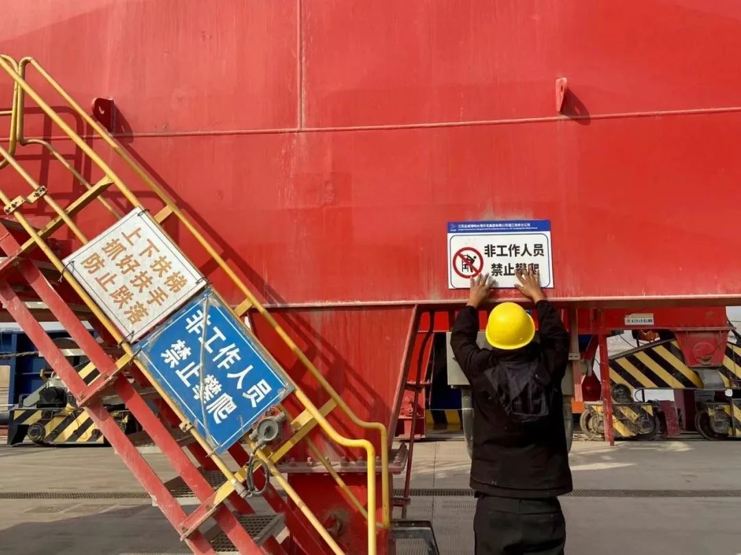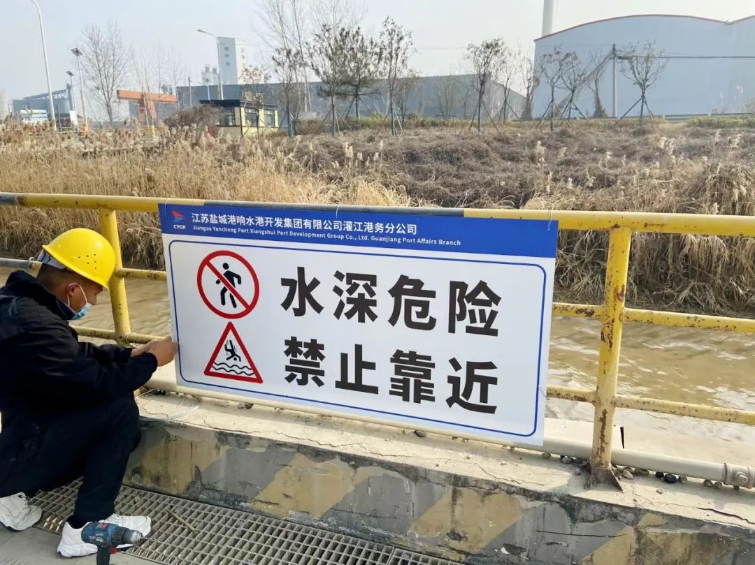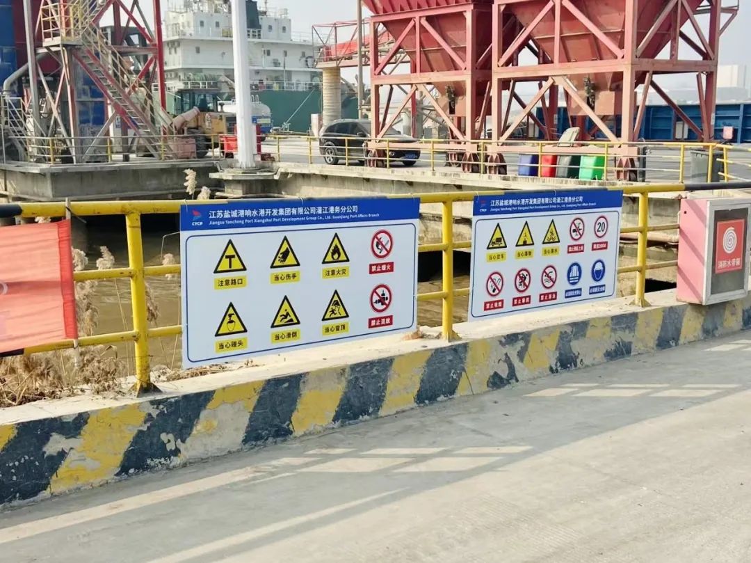 在港區(qū)門(mén)閘處設(shè)置“非作業(yè)車(chē)輛、工作人員禁止入內(nèi)”標(biāo)識(shí),提示社會(huì)人員、車(chē)輛不要誤闖誤入港區(qū)。在引橋欄桿上懸掛“注意路口,當(dāng)心貨車(chē)”“禁止酒后上崗,必須戴安全帽”等標(biāo)識(shí),提醒工作人員注意自身安全,嚴(yán)肅上崗紀(jì)律;在碼頭后沿護(hù)欄上懸掛“禁止翻越”“水深危險(xiǎn),禁止靠近”,警示工作人員不要翻越碼頭護(hù)欄,遠(yuǎn)離危險(xiǎn)水域。本次完善新增警示標(biāo)識(shí)牌共十余塊。