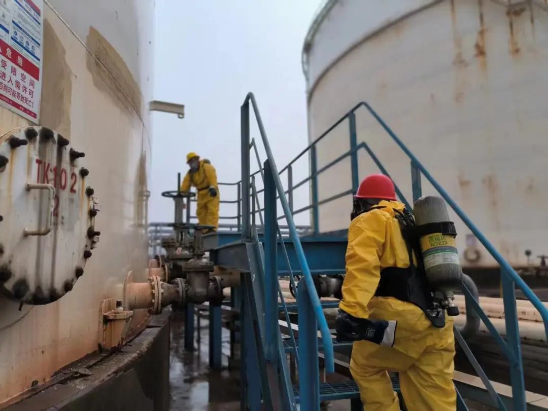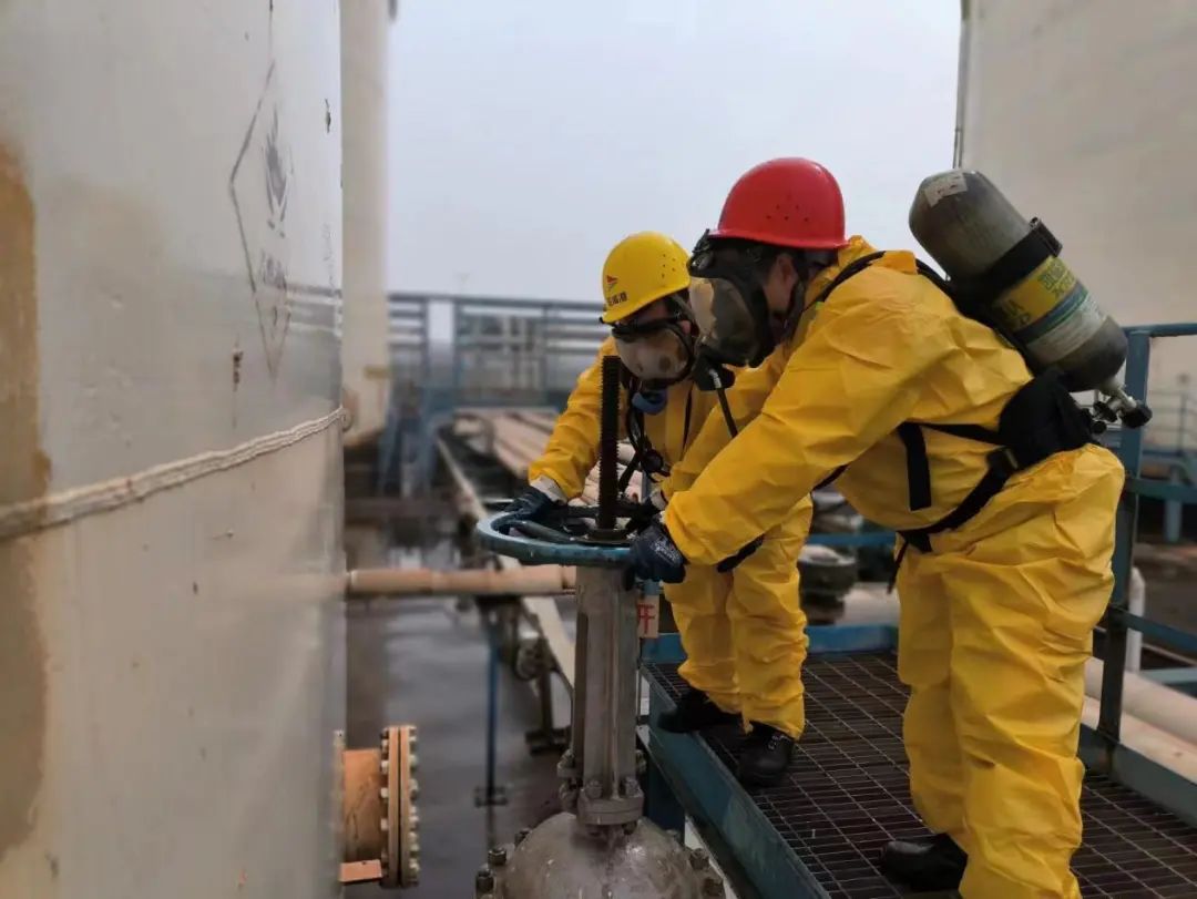 通訊警戒組在安全區(qū)域拉起警戒線,救援組迅速穿戴防護用品,緊急切斷TK102閥門。
