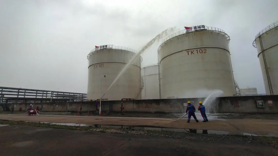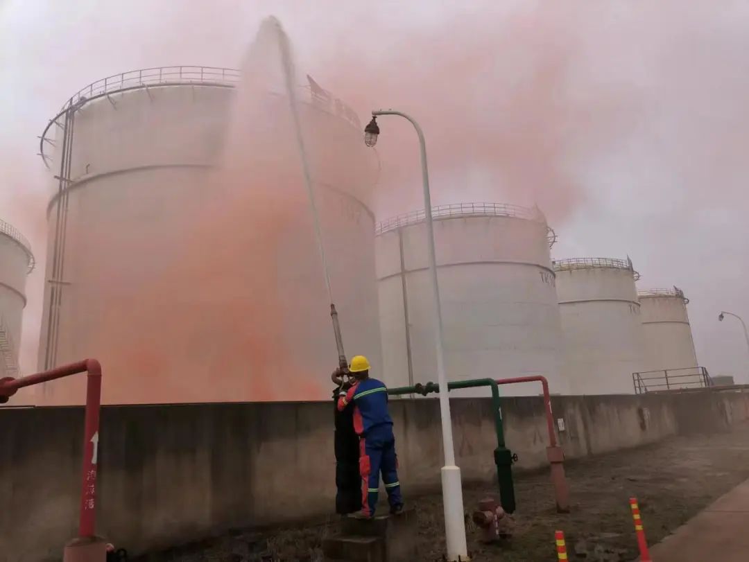 火情失控后,應急搶險組用移動泡沫裝置滅火,并開啟噴淋對儲罐降溫,同時使用水炮對儲罐加強降溫。在各小組的有序配合下,本次演練圓滿結束。