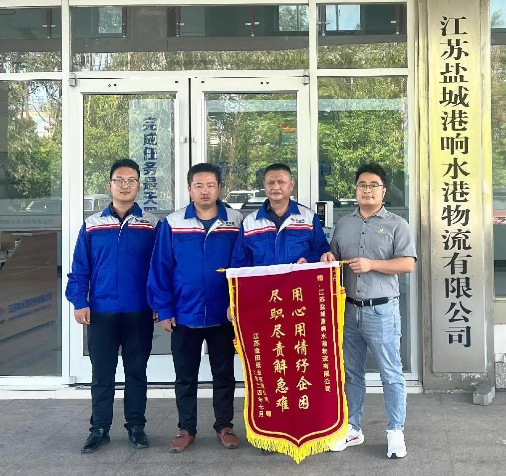 近日,鹽城港響水港區(qū)物流公司收到江蘇金田紙業(yè)有限公司贈送的“用心用情紓企困 盡職盡責(zé)解急難”錦旗,來表達對港區(qū)在成品紙運輸期間優(yōu)質(zhì)服務(wù)的認(rèn)可和感激之情。
