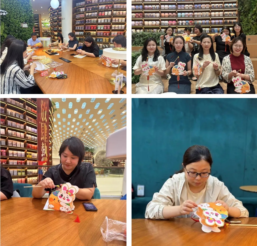 系上流蘇繩,穿上燈帶,扣入玉兔,大家認(rèn)真制作著屬于自己的花燈,一個(gè)個(gè)俏皮可愛的古風(fēng)燈籠就制作成型了。制作玉兔花燈環(huán)節(jié)讓組員們親自動(dòng)手體驗(yàn)了文化遺產(chǎn)的魅力,不僅展示了組員們的創(chuàng)造力,也體現(xiàn)了對(duì)傳統(tǒng)文化的傳承與尊重。燈籠制作完成后,所有參與人員在花燈的映照下合影留念,留下了這個(gè)溫馨時(shí)刻的美好記憶。