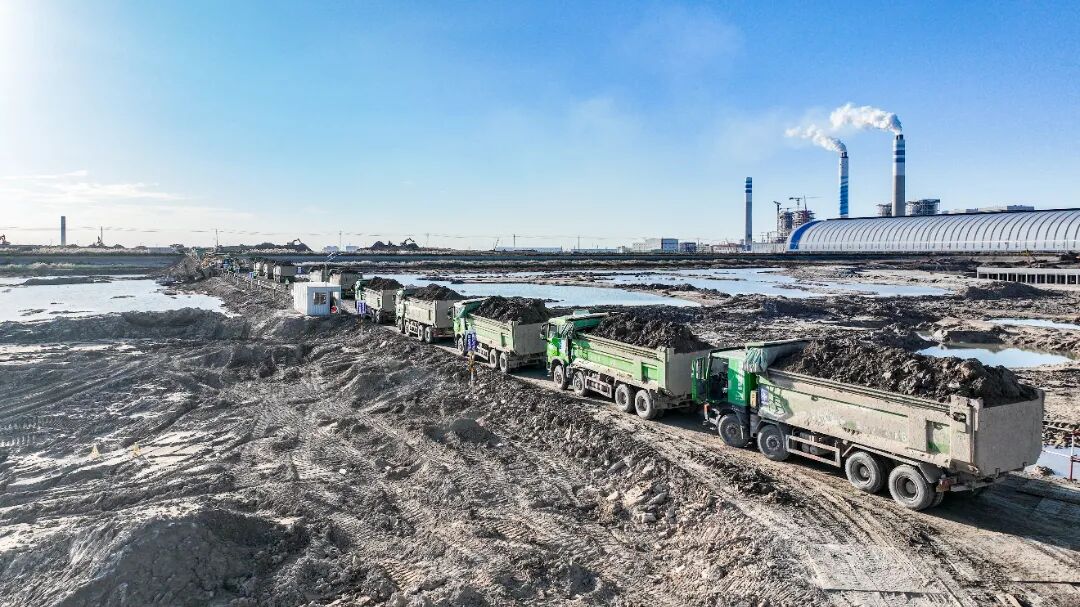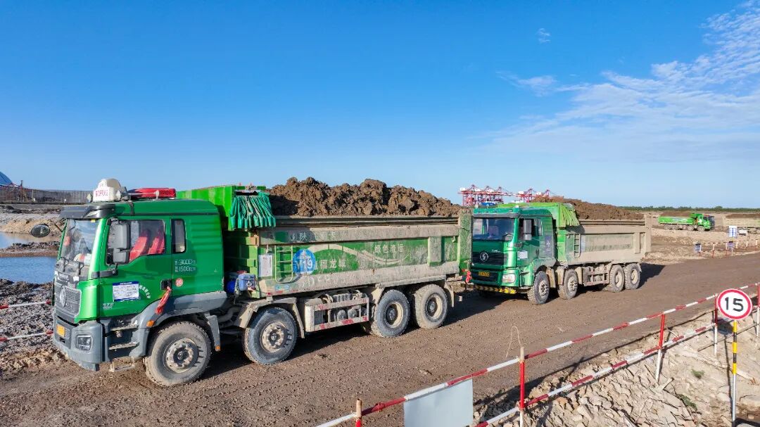 多臺(tái)挖掘機(jī)、運(yùn)輸車(chē)往來(lái)穿梭