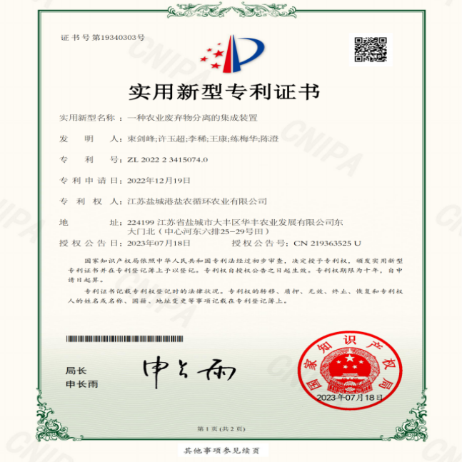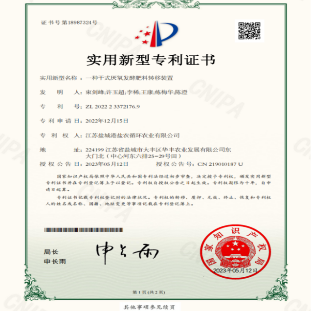 扎實(shí)推進(jìn)科研創(chuàng)新,不斷將理論研究成果轉(zhuǎn)化到實(shí)際生產(chǎn)過程與產(chǎn)品中,截至目前,鹽農(nóng)循環(huán)農(nóng)業(yè)先后取得了3個肥料登記證,獲得自主研發(fā)專利24項(其中發(fā)明專利4項),另外還有15項專利已受理。率先使用新型機(jī)械沼液還田機(jī),實(shí)現(xiàn)沼液在旱作物大面積推廣施用,替代70%以上化肥用量,將理論轉(zhuǎn)化為實(shí)際。“沼液在稻麥輪作上施用技術(shù)規(guī)范”地方標(biāo)準(zhǔn)成功立項,為沼液推廣應(yīng)用打下堅定的基礎(chǔ)。 申報成功國家高新技術(shù)企業(yè)、江蘇省農(nóng)業(yè)科技型企業(yè)、江蘇省三星上云企業(yè)、市級農(nóng)業(yè)產(chǎn)業(yè)化龍頭企業(yè)等稱號。與揚(yáng)州大學(xué)等高校共同申報的2022年江蘇省碳達(dá)峰碳中和科技創(chuàng)新專項資金項目-沿海灘涂農(nóng)田生態(tài)碳匯能力提升模式構(gòu)建和試驗示范基地建設(shè)也正在按進(jìn)度穩(wěn)步推進(jìn)。