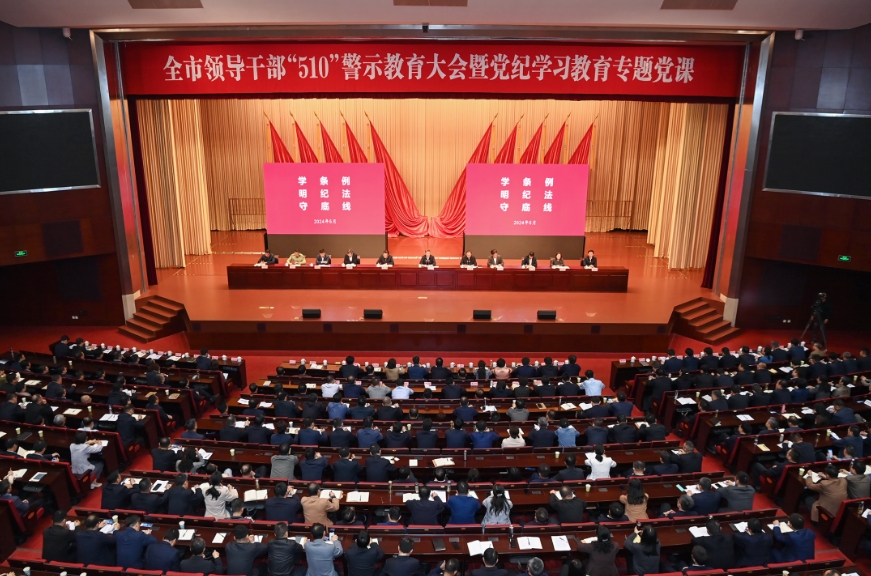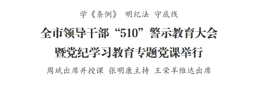 5月10日,全市領導干部“510”警示教育大會暨黨紀學習教育專題黨課舉行,深入學習習近平總書記關于黨的自我革命的重要思想,全面落實黨中央和省市委關于黨紀學習教育的部署要求,深化以案為鑒、以案明紀、以案促改,推動全市黨員干部和公職人員認真學習《中國共產(chǎn)黨紀律處分條例》,真正做到學紀、知紀、明紀、守紀,為推進中國式現(xiàn)代化鹽城新實踐提供堅強紀律保障。市委書記周斌出席并講授黨紀學習教育專題黨課。市委副書記、市長張明康主持,市人大常委會主任王榮、市政協(xié)主席羊維達出席。