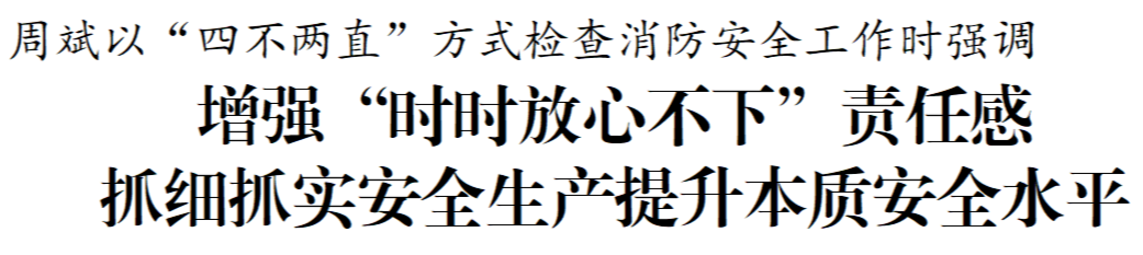 6月27日下午,市委書記周斌以“四不兩直”方式檢查消防安全工作。他強調(diào),要深入學(xué)習(xí)貫徹習(xí)近平總書記關(guān)于安全生產(chǎn)和消防工作的重要論述,按照省市委部署要求,時刻繃緊安全生產(chǎn)這根弦,增強“時時放心不下”的責(zé)任感和“事事心中有底”的行動力,抓實抓細(xì)隱患排查整治,壓緊壓實各方責(zé)任,全面筑牢安全防線,切實維護(hù)人民群眾生命財產(chǎn)安全。