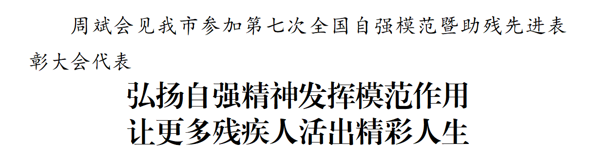 5月26日,市委書記周斌會見我市參加第七次全國自強模范暨助殘先進表彰大會代表,向受表彰對象表示祝賀,向全市廣大殘疾人和殘疾人工作者致以問候,希望全市上下認真學習貫徹習近平總書記關(guān)于殘疾人事業(yè)的重要指示精神,全面落實中央和省委部署要求,讓更多殘疾人活出精彩人生,在新征程上推動我市殘疾人事業(yè)高質(zhì)量發(fā)展。